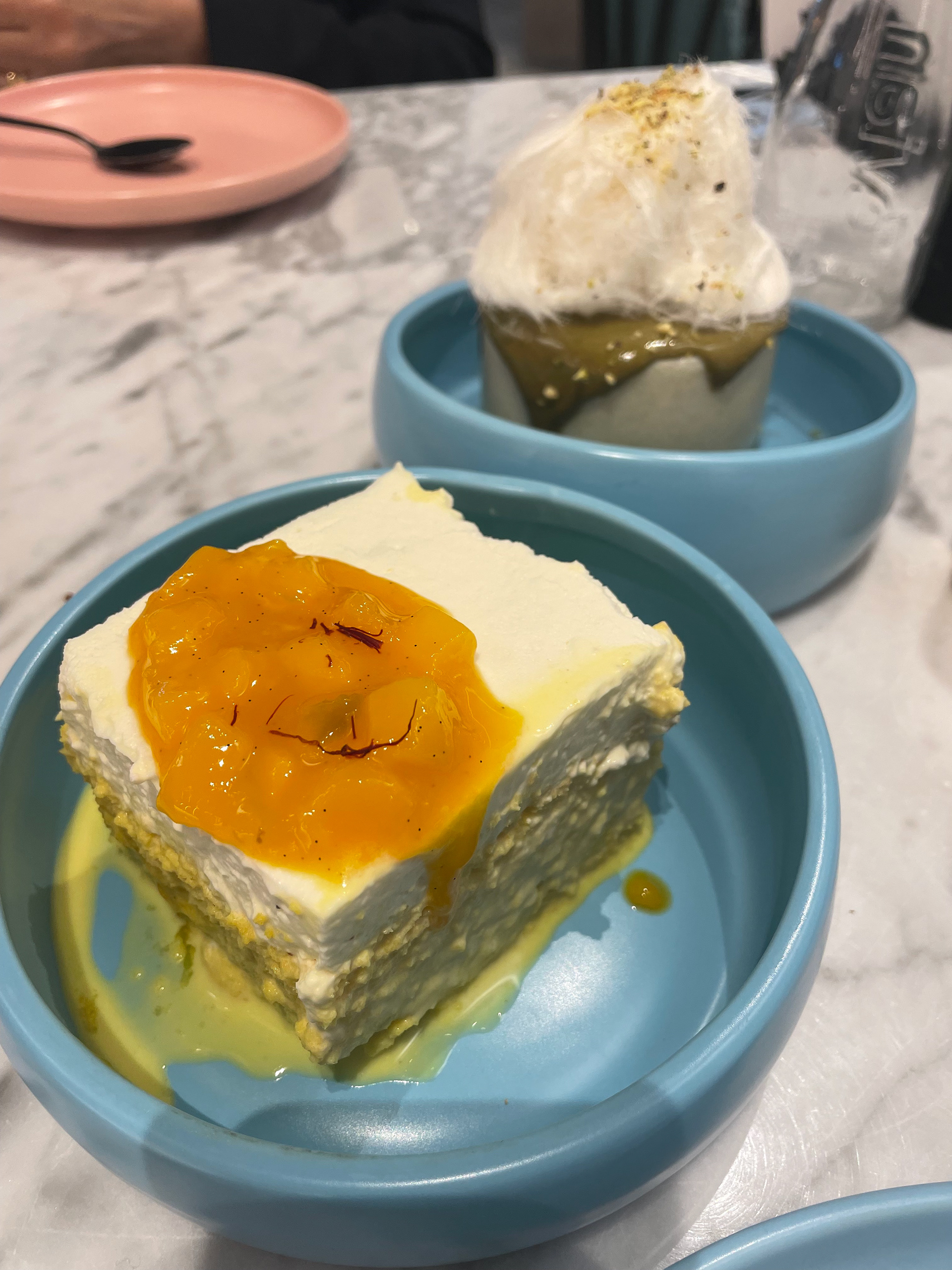 Saffron Milk Cake, topped with mango, from Life with Cacao. The eagle-eyed (and hungry) among you will also notice the scrumptious pistachio cake in the background, topped with pashmak/pişmaniye.