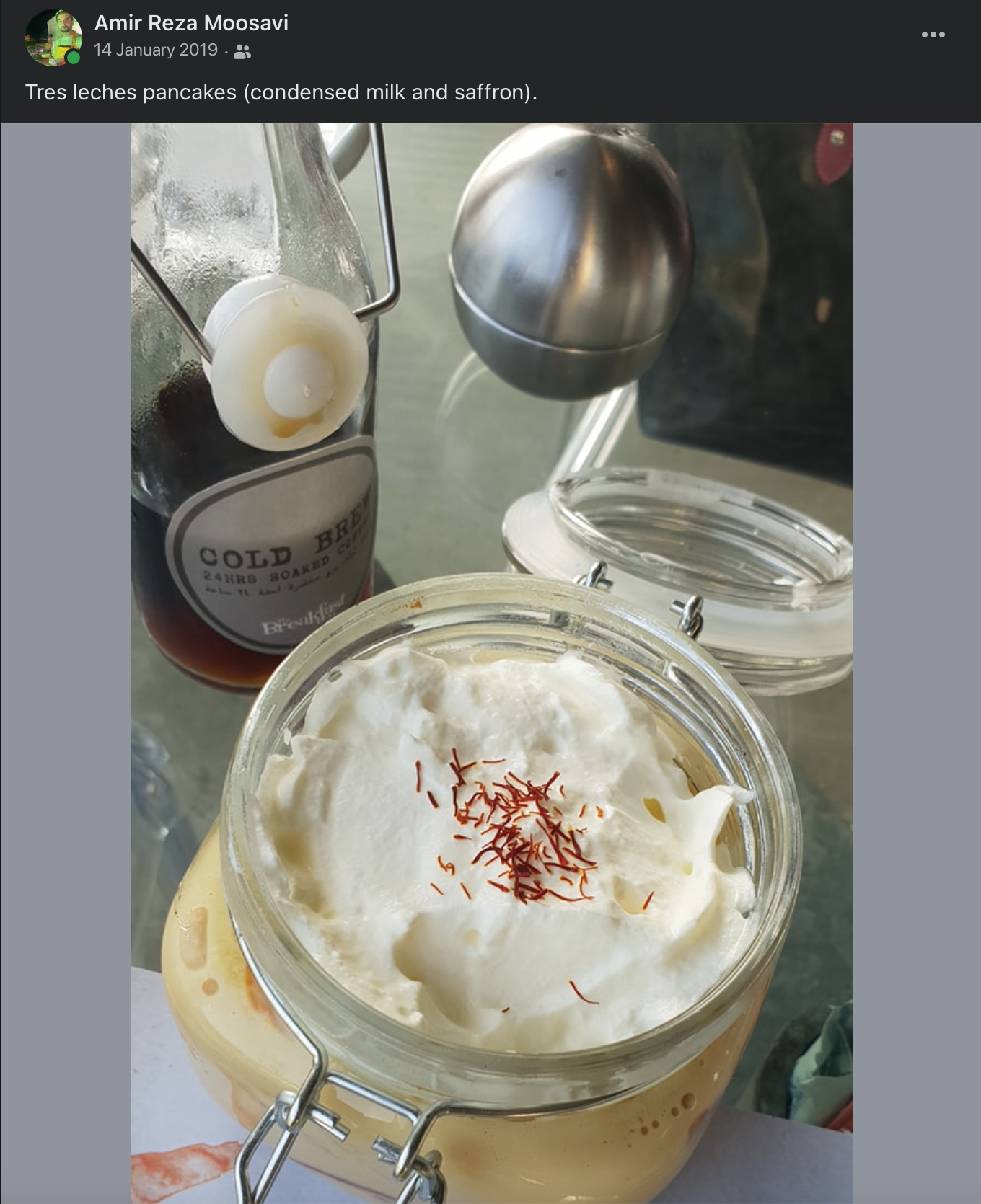 When conducting a Facebook search, I was surprised to find a post of mine from January 2019 for "tres leches pancakes with saffron". These were from The Breakfast Club in Kuwait, and I found the original photo on my phone, dated from the 19th of December 2018, so this may have actually been the first time I had tres leches of any sort.