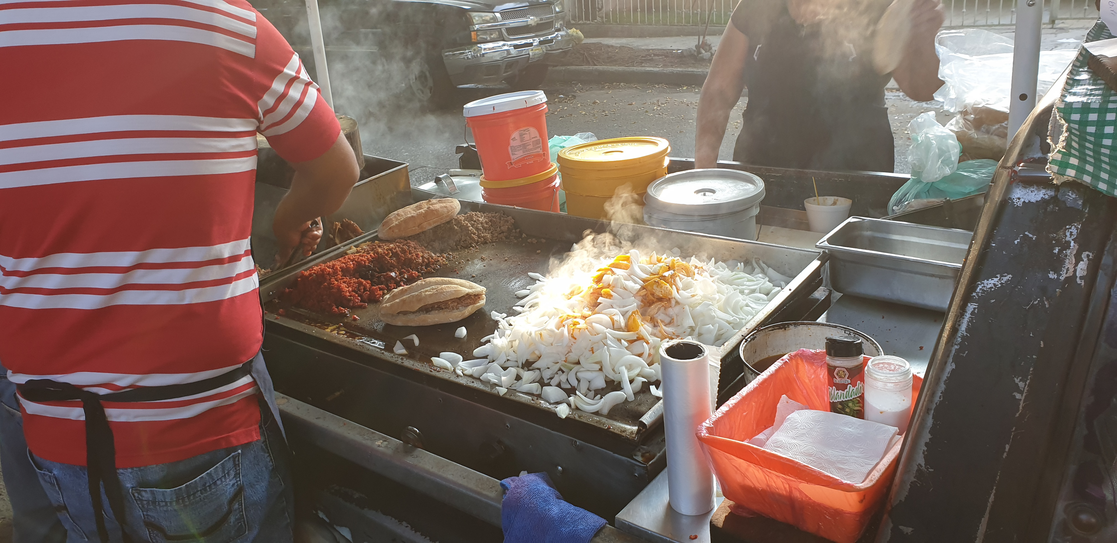 The next morning, I would have my first meal in the country, from a stand outside the Centro de Enseñanza Técnica Industrial university called Lonches Don Perro. Known as "tortas" in the rest of Mexico, "lonches" are what the residents of Jalisco call sandwiches made from bolillo rolls. And for my first meal, I had to go for a lonche de birria: a sandwich stuffed with a hearty goat stew, the meat marinated in an assortment of chiles and herbs and spices.
